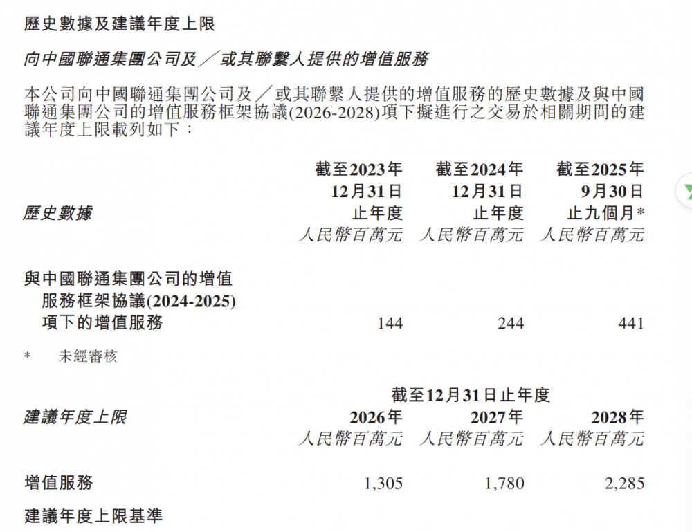 与中国联通:2025年增值服务上限由5亿元上调至8.15亿元;服务供应协议(非通信服务)2025年从6.8亿元上调至7.3亿元,2026年上限由7.3亿元上调至11亿元;同时,双方已签署2026–2028年新一期增值服务框架协议,建议年度上限分别为13.05亿元(2026年)、17.8亿元(2027年)和22.85亿元(2028年)。