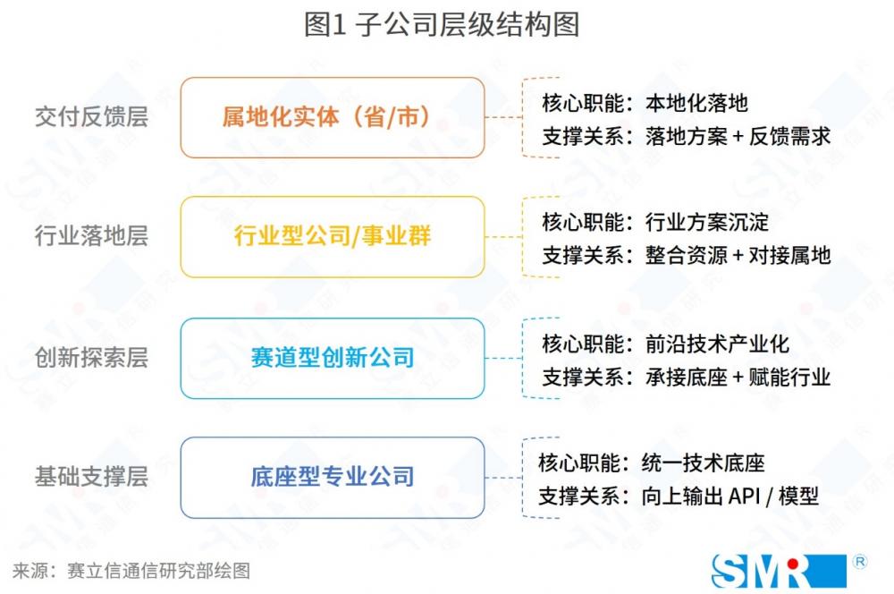 在子公司体系逐渐成型后,中国电信通过职能分层实现了体系化治理。不同类别的子公司承担不同角色,共同形成了从技术底座到行业方案再到属地交付的闭环。