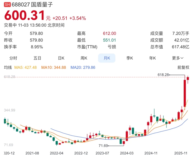 作为A股最纯正的量子科技龙头,国盾量子股价一路上涨,并在10月30日历史性突破600元的股价,总市值亦超过600亿元。