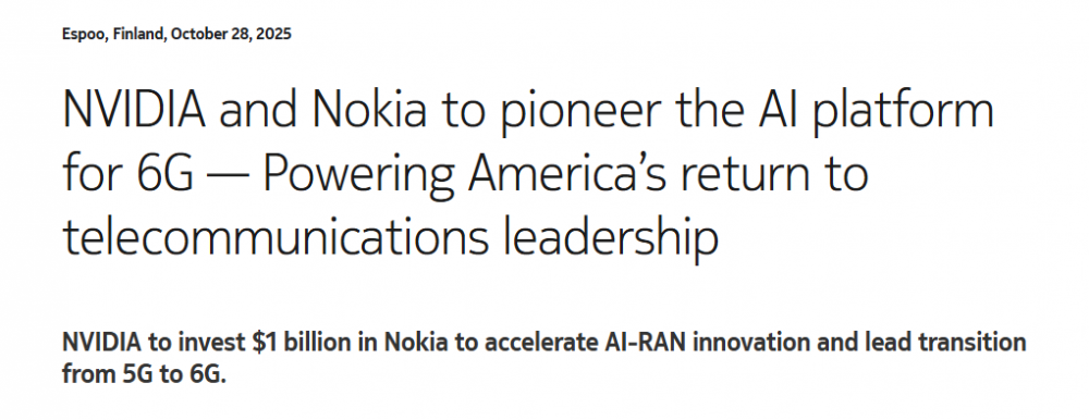 C114讯 11月3日消息(岳明)日前,英伟达与诺基亚宣布达成战略合作伙伴关系,英伟达将以每股6.01美元的认购价格向诺基亚投资10亿美元,双方合作主要着眼于AI-RAN市场以及面向未来的6G演进。
