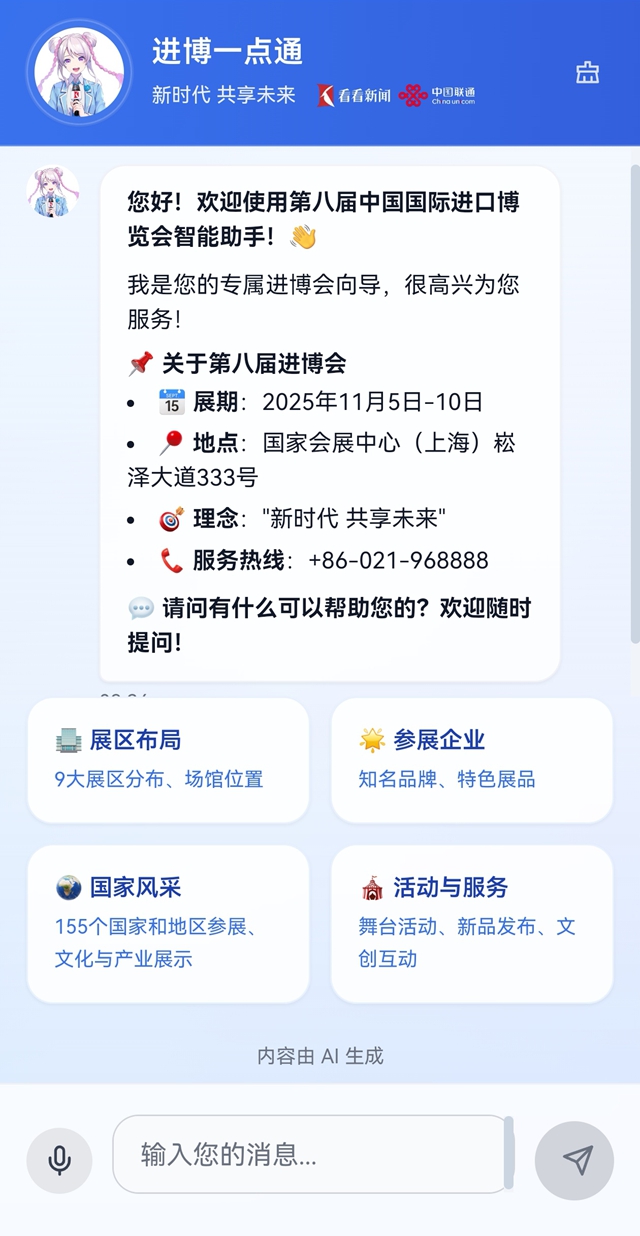 想随时了解展商、展品、论坛活动,怎么办?今年,上海广播电视台(SMG)携手上海联通,在其“看看新闻”APP内上线“进博一点通”AI智能助手,有效解决了传统展会中信息获取不便、导览效率不高等痛点。