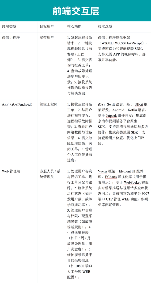 前端交互层是系统与用户(宽带用户、智家工程师、客服人员)直接交互的入口,核心目标是提供 “轻量化、易用性、多终端适配” 的用户体验。本层的设计遵循 “无需复杂操作、一键触达服务” 的原则,支持多种终端类型与交互方式,同时集成南京为和视频话务平台的轻量化呼叫能力: