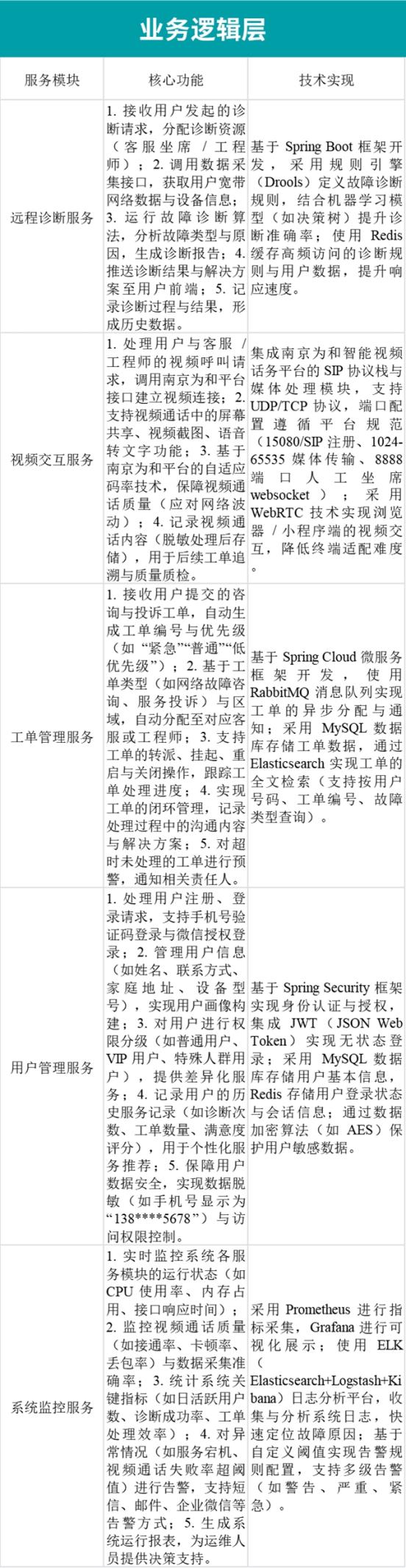 2.功能实现层面:六大核心功能模块(远程数据采集、故障诊断、视频交互、工单管理、用户管理、系统监控)形成完整的服务闭环。远程数据采集模块通过多协议适配实现用户侧数据全面获取;故障诊断模块采用 “规则引擎 + AI 算法” 提升诊断准确率;视频交互模块依托南京为和平台实现 “无需 APP、一键视频” 的便捷服务;工单管理模块确保用户诉求闭环处理;用户管理模块通过画像与标签实现个性化服务;系统监控模块保障系统稳定运行。