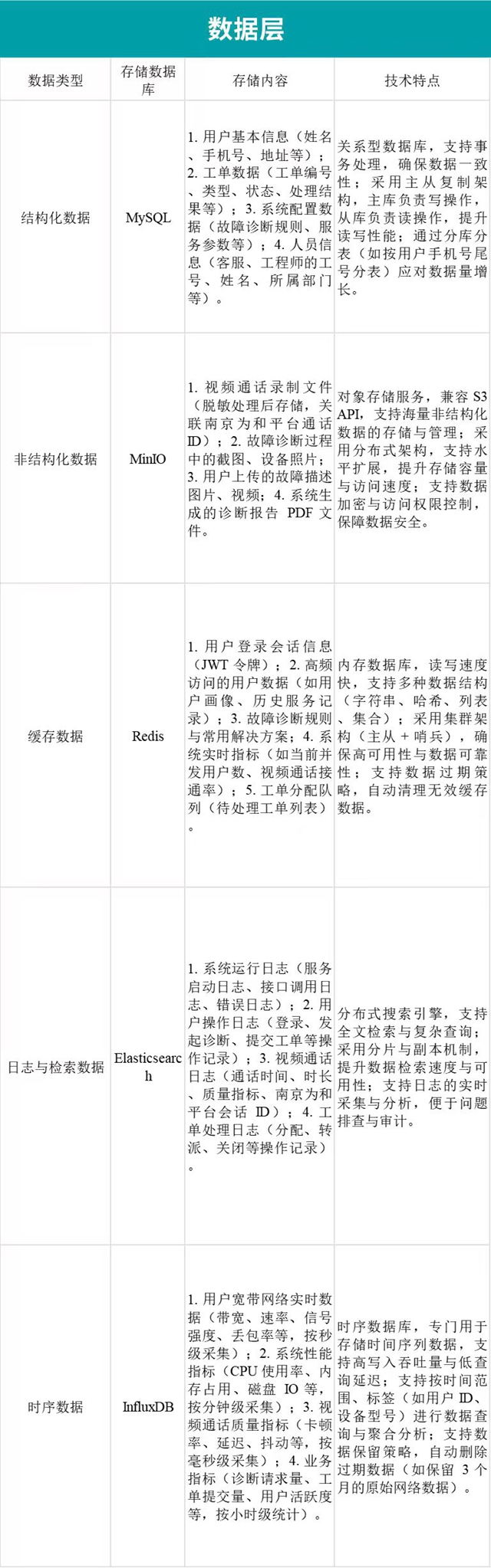 数据层是系统的 “数据存储与管理中心”,负责存储系统运行过程中产生的各类数据(如用户数据、网络数据、工单数据、视频数据),并提供数据查询、统计、分析等服务,保障数据的安全性、完整性与可用性。本层采用 “多数据库协同” 的存储方案,根据数据类型与访问需求选择合适的数据库产品: