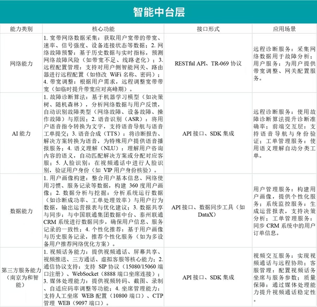 智能中台层是系统的 “能力支撑核心”,依托中国联通集团统一的智能网络中台,整合网络能力、AI 能力、数据能力与南京为和智能视频话务平台的第三方服务能力,为业务逻辑层提供标准化的能力接口,实现 “能力复用、快速创新”。本层的核心能力包括:
