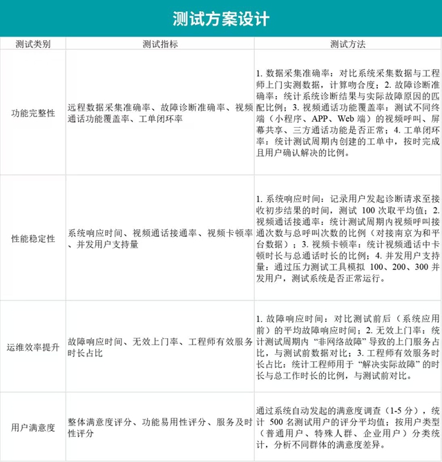为全面验证系统性能与应用价值,项目团队于 2024 年 11 月 - 12 月开展现场测试,测试范围覆盖泰州联通 10 个区县的 10 个社区(含老旧小区、新建商品房、企业园区),选取 500 名用户(其中普通家庭用户 400 名、特殊人群用户 50 名、企业用户 50 名)作为测试对象,测试周期 1 个月。测试指标分为四类:功能完整性、性能稳定性、运维效率提升、用户满意度,具体测试方法如下:
