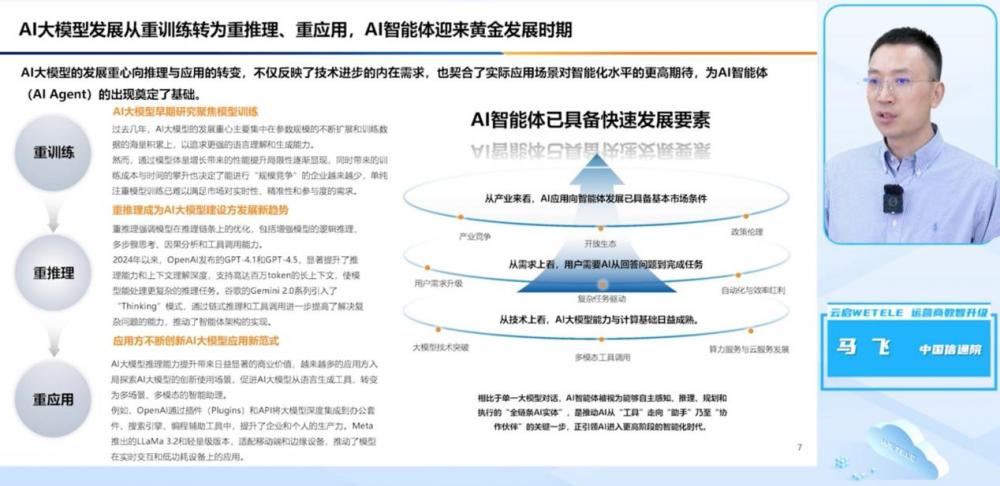 当前,AI大模型向多模态融合发展,形成全球技术领先者与多元应用生态共生格局。AI大模型发展从重训练转为重推理、重应用,AI智能体迎来黄金发展时期。马飞谈到,AI大模型的发展重心向推理与应用的转变,不仅反映了技术进步的内在需求,也契合了实际应用场景对智能化水平的更高期待,为AI智能体的出现奠定了基础。