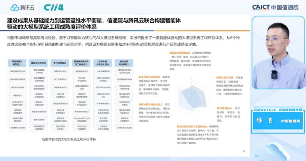 目前,腾讯云已经和运营商合作,打造了一批典型应用案例。马飞提到,中国信通院与腾讯云联合构建了智能体驱动的大模型系统工程成熟度评价体系,从6个维度共选取48个指标评价系统的构建与运维水平,供建设方进行产品成熟度评估。