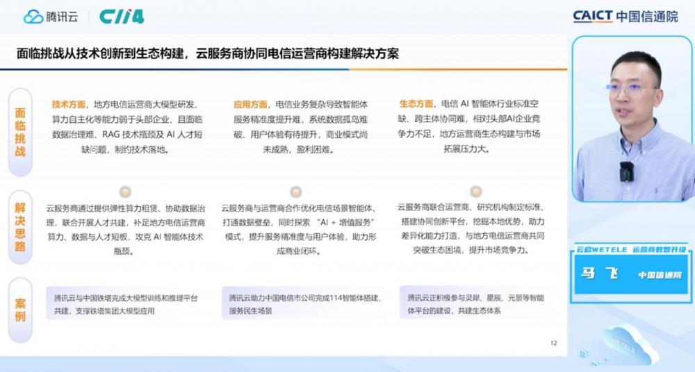 马飞指出,构建智能体驱动的大模型系统工程,有六大关键技术和能力:开发层面需要智能体开发平台、工作流;运行层面需要基础大模型、检索增强生成、联网搜索、智能体安全管理。同时运营商面临多重挑战,例如在技术层面存在开发能力不足、应用层面需打破数据孤岛,探索商业模式、生态层面相对头部AI企业竞争力不足等。