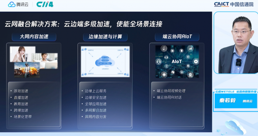 在云网融合方面,腾讯云注意到了几个趋势:跨境数据传输激增、宽带业务场景化转型、5G专网推动边缘计算落地、IoT平台加速智能化成为AIoT。针对上述变化,腾讯云提出的云网融合解决方案进行了针对性部署,例如面向直播加速、跨境加速等场景,提供高性能高可用的内容分发和传输服务;依托广泛覆盖的边缘节点,为高带宽服务提供底层支撑;提供端云协同的视频处理能力、AI对话能力等。