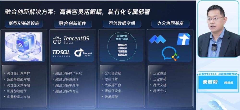 在融合创新方面,腾讯云看到三个变化:一是我国已经进入到系统攻坚阶段,要求业界构建全栈可控、安全可靠的技术底座和生态体系;二是可信数据空间正在从试点走向规模部署,呼唤基础设施的强力支撑;三是智能办公更关注AI协同、多人在线协作、工作流整合等能力。腾讯云为此助力运营商搭建了新型AI基础设施,提供融合创新组件以及可信数字化底座,和企业微信、腾讯文档、腾讯会议等应用,从单点创新走向系统级创新。