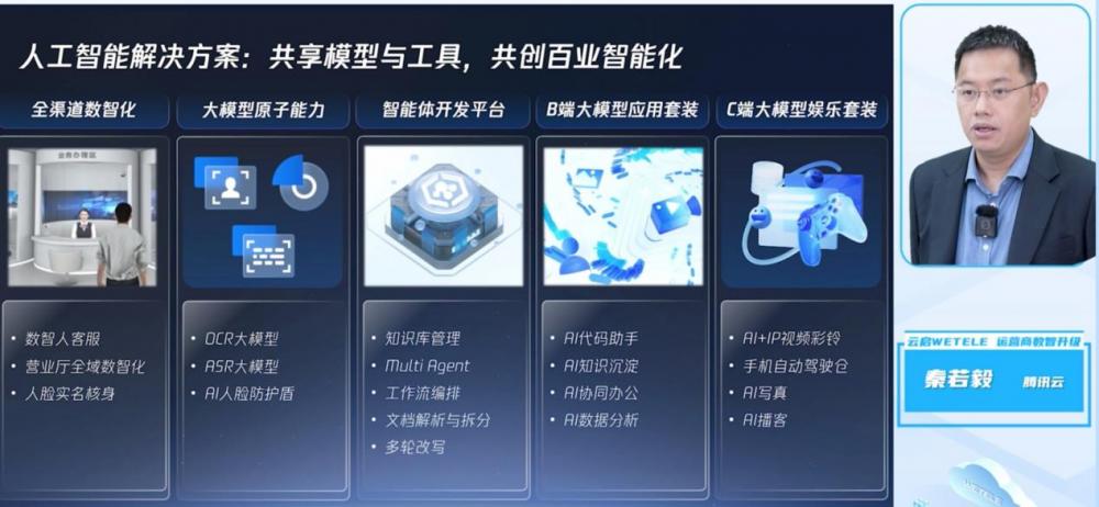 在人工智能方面,腾讯云注意到四个变化:AI原子能力大模型化、智能体成为产业变革的新引擎、B端模型应用日趋成熟、C端用户体验被多模态AI重塑。腾讯云为此打造了全渠道的数字化能力,以及大模型原子能力、智能体开发平台、B端和C端的模型应用套装,助力运营商推动人工智能在千行百业应用。