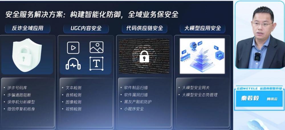 在安全服务方面,腾讯云看到了人工智能与安全的双向融合。大模型推动安全能力升级,从被动响应迈向主动预测,同时也带来了新的安全风险,如样本投毒、提示词注入、模型劫持、智能体权限滥用等。腾讯云致力于为运营商构建智能化的防御体系,实现全域业务安全护航,包括反诈类应用、UGC内容安全、代码供应链安全以及大模型应用安全等。