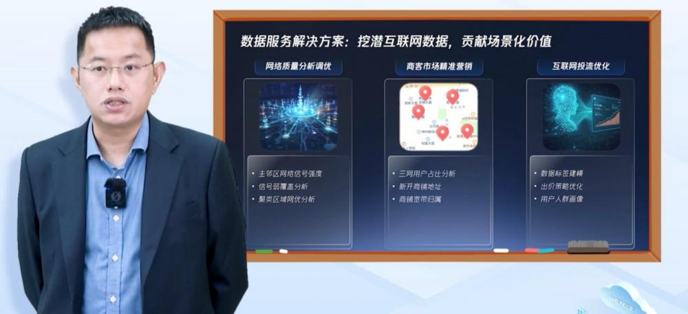 在数据服务方面,腾讯云注意到数据对于运营商的三块价值:数据助力基站调优治理、商客市场走向精准营销、线上投流趋于降本增效。腾讯云打造数据服务解决方案,通过深度挖掘互联网数据,可以为运营商提供精准高效的数据支撑,例如信号弱覆盖分析、三网用户占比分析、用户人群画像等。