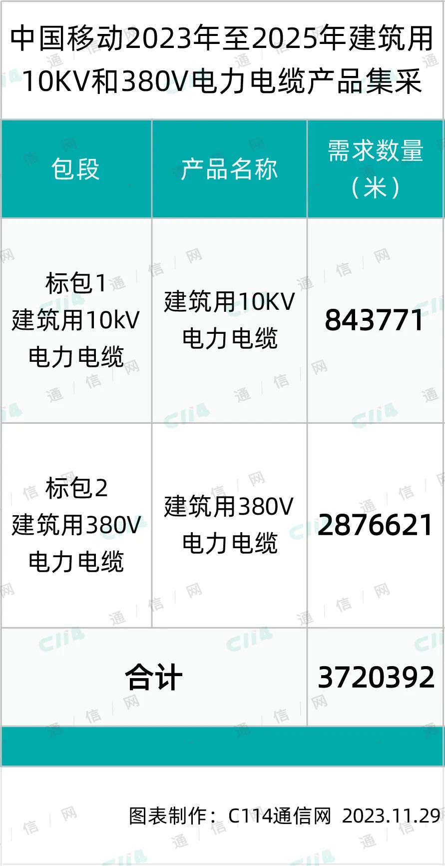 据此前,中国移动发布的集采公告显示,本次中国移动集中采购的建筑用10kV和380V电力电缆产品,预估采购规模为:建筑用10kV电力电缆84.38万米,建筑用380V电力电缆287.66万米。项目采用混合招标,划分2个标包。