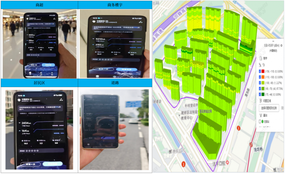 在高热商超及写字楼场景中,部署了最新的4频Lampsite设备,并开通320M大带宽5G小区,结合DMIMO技术,有效将干扰转化为信号增益,为用户提供随时随地的流畅网络与高质量语音服务,实测峰值速率超过3200Mbps。在居民区场景,采用“宏微协同”覆盖策略,通过双频AAU实现多频高性能网络广覆盖,再配合微站精准补盲,有效解决深度覆盖不足问题,实测峰值速率可达2400Mbps以上。